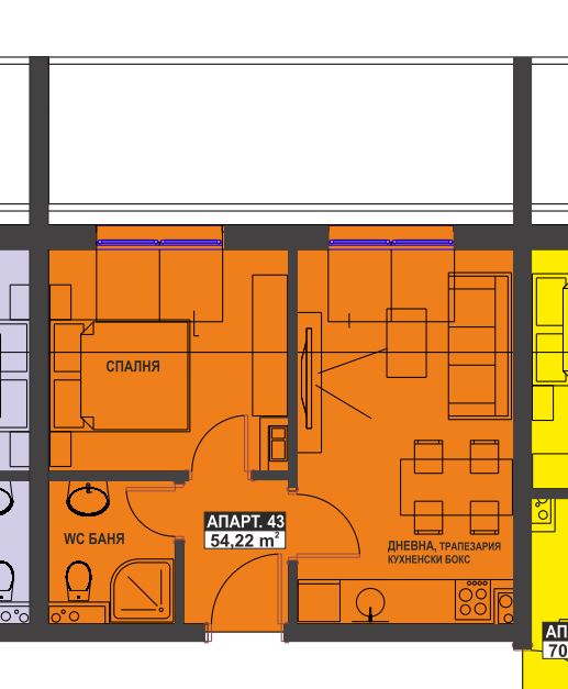 Nabízíme vám byt s jednou ložnicí o ploše 54,22 m², nacházející se v sedmém patře nového obytného domu, který bude postaven v sídlišti „Bratya Miladinovi“ pod Vojenskou nemocnicí v Burgasu. Budova je navržena se dvěma vstupními sekcemi, suterénem, přízemím a sedmi patry, nabízející moderní a funkční bydlení.
