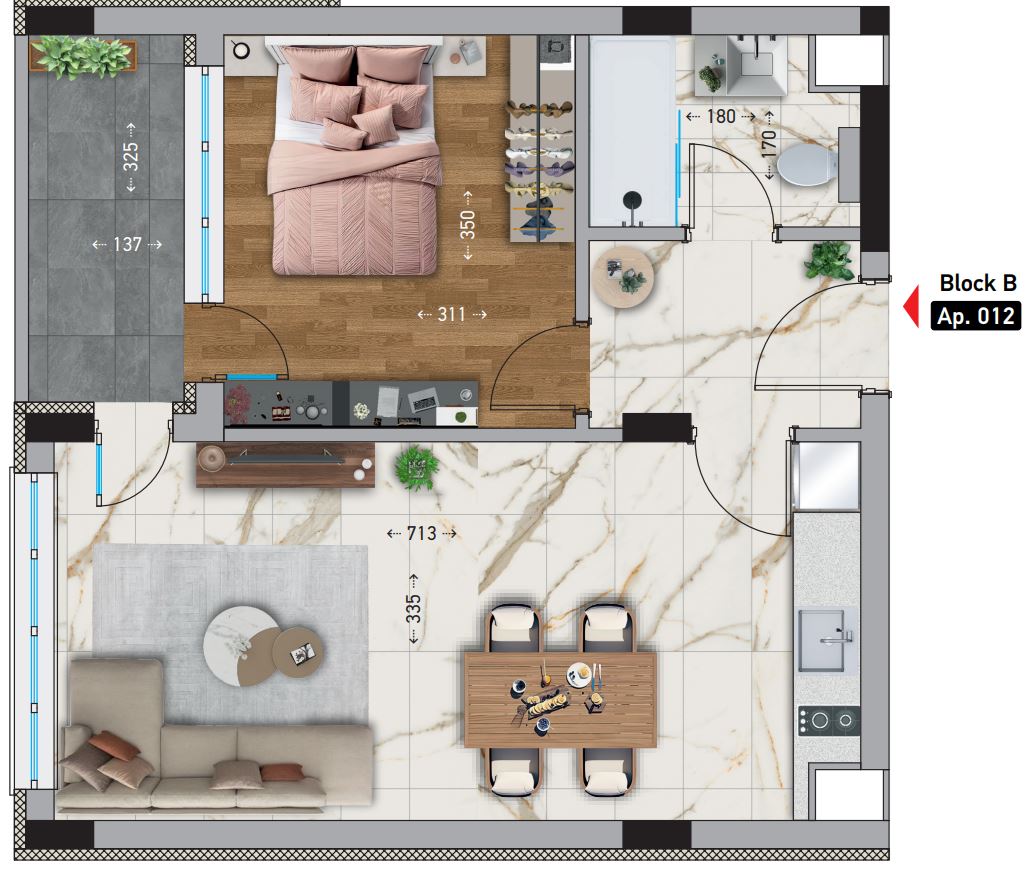 Apartmán má promyšlené dispoziční řešení, které zajišťuje praktické a pohodlné každodenní užívání. Prostory jsou světlé a útulné, vhodné pro celoroční bydlení i rekreační pobyty. Přízemní poloha umožňuje snadný přístup ke společným prostorám a relaxačním zónám komplexu. Apartmán je předáván ve standardu „na klíč“, s možností balíčku vybavení za příplatek.