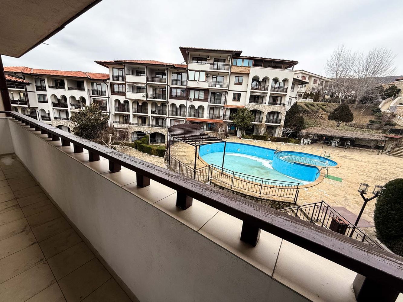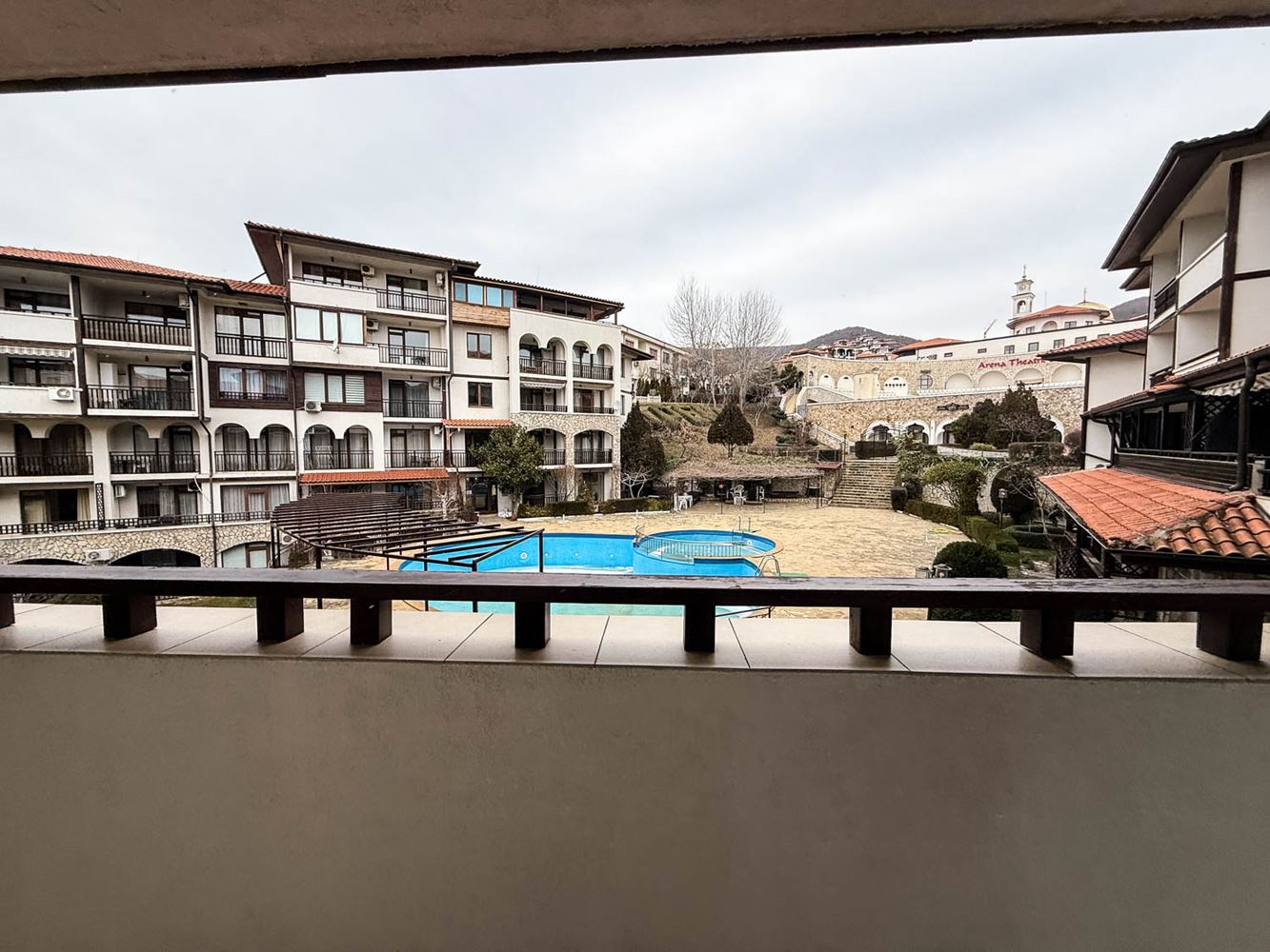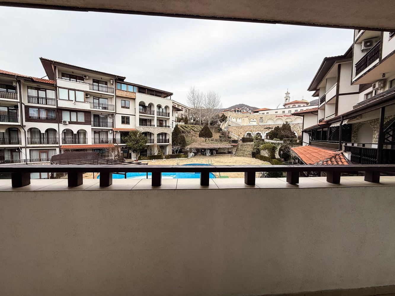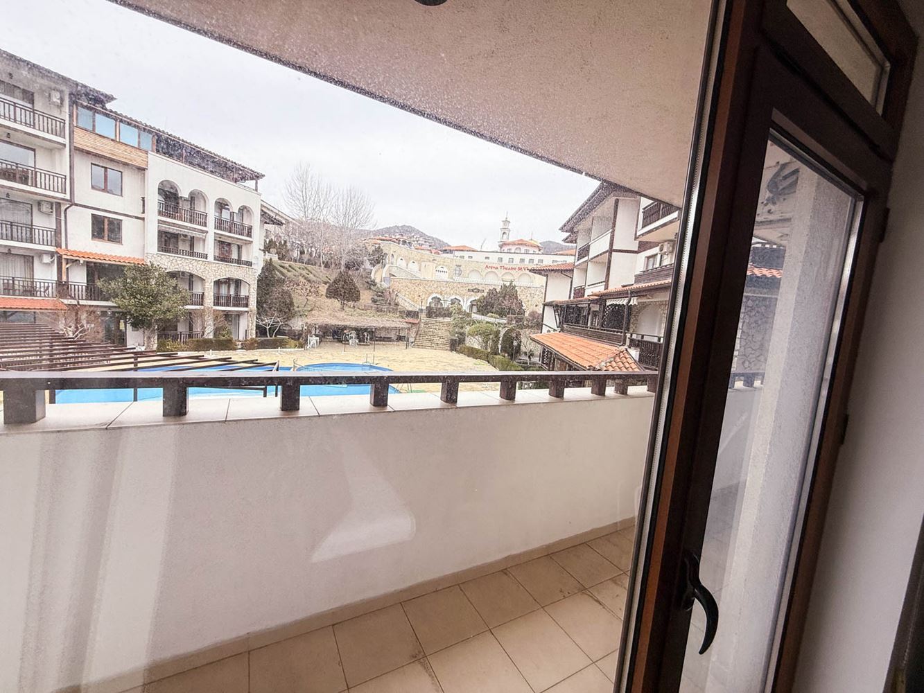 Byt se skládá z útulného obývacího pokoje s kuchyňským koutem, ložnice, koupelny s toaletou a terasy, ze které se otevírá příjemný výhled na bazén a zelené plochy komplexu. Prostor je uspořádán prakticky a přirozené světlo přispívá k pocitu prostornosti a klidu. Nemovitost se prodává plně zařízená, což umožňuje okamžité využití bez nutnosti dalších nákladů.