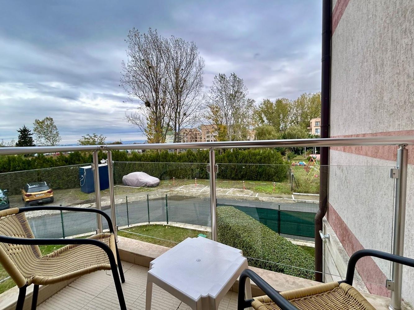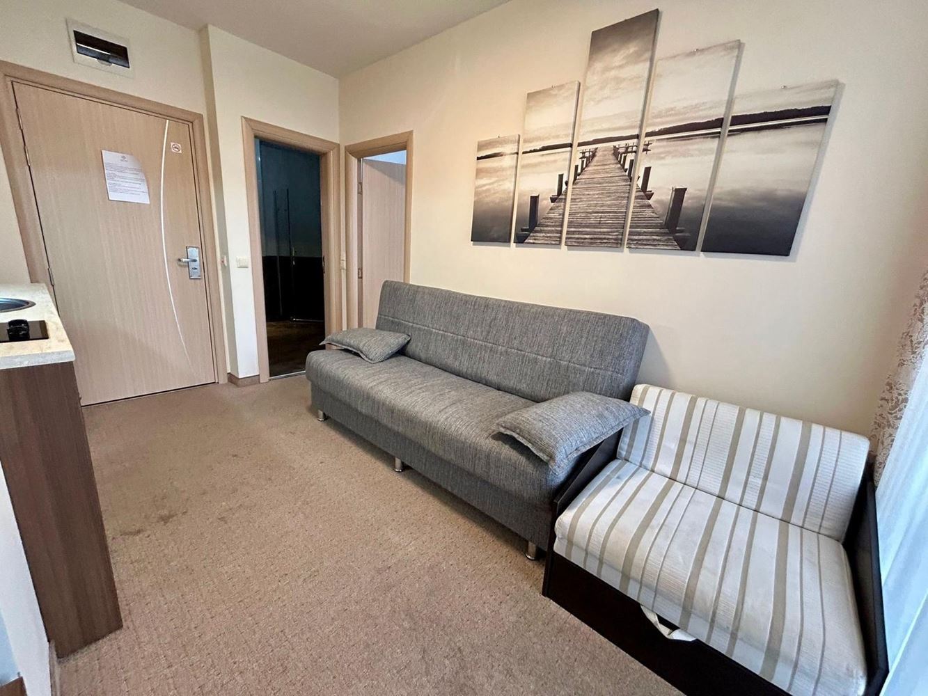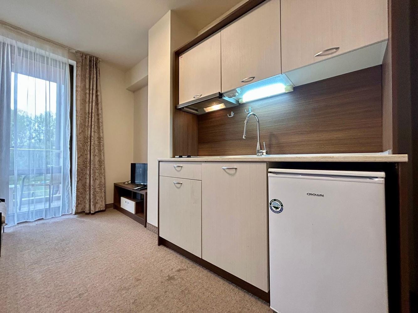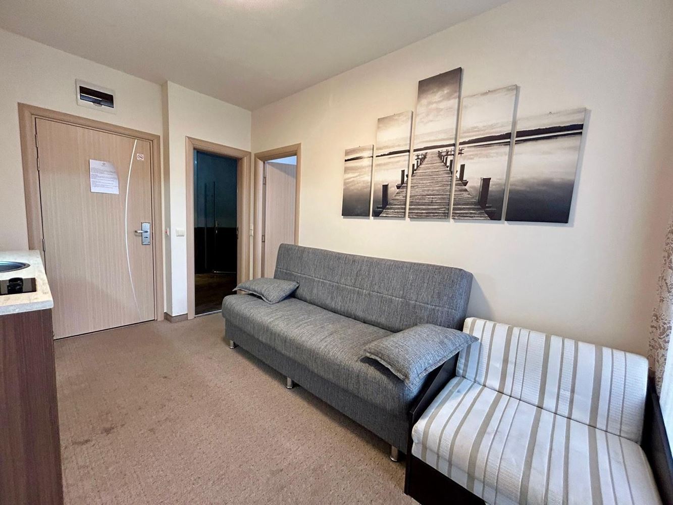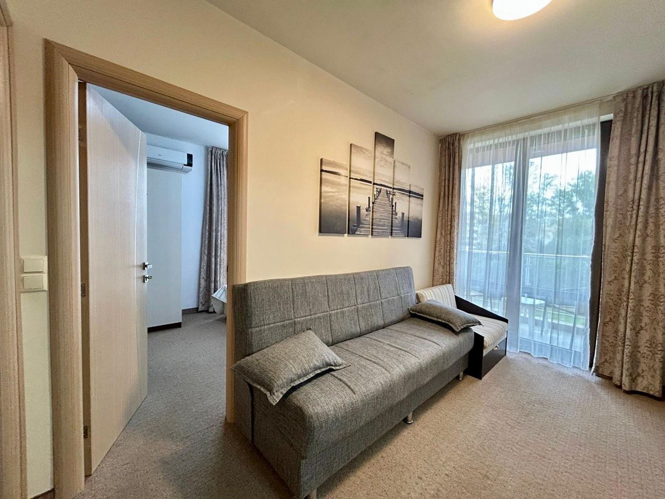Dispozice je pečlivě promyšlená: světlý obývací pokoj s kuchyňským koutem a jídelnou, příjemná ložnice, moderní koupelna a balkon s výhledem na zeleň komplexu – ideální místo pro ranní kávu a odpočinek. Apartmán se prodává kompletně zařízený a vybavený spotřebiči, ve vynikajícím stavu – připravený k okamžitému užívání bez dalších investic.