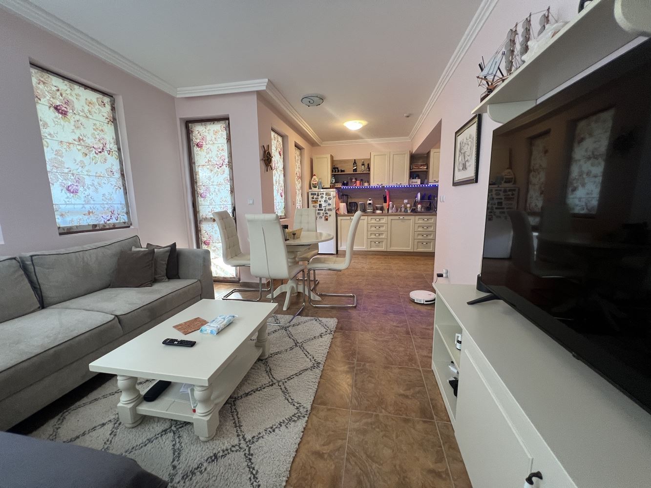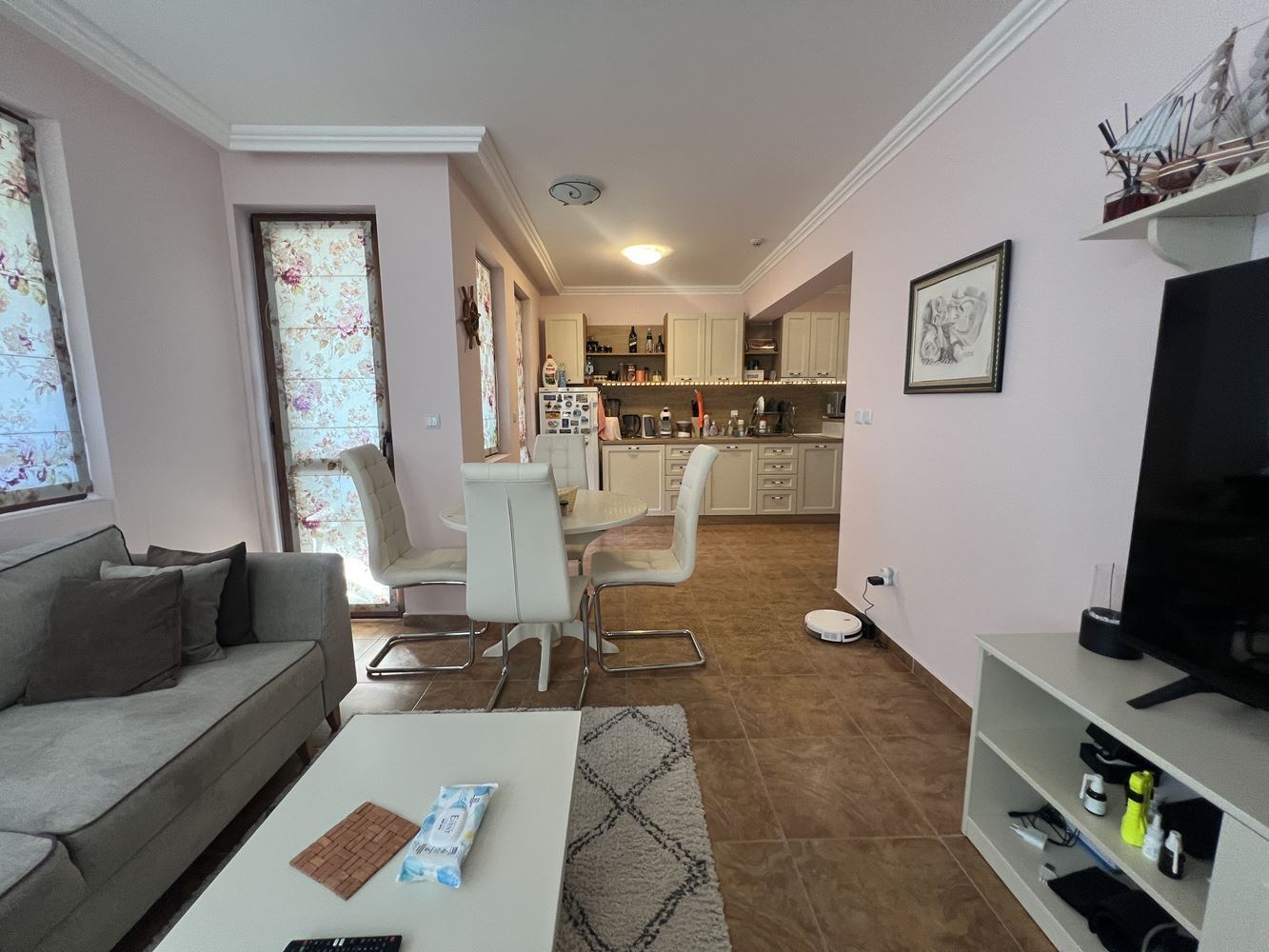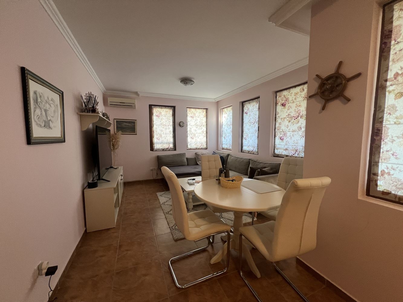 Nemovitost má plochu 80 m² a nachází se ve druhém patře. Dispozice je funkční a pohodlná, což ji činí vhodnou jak pro celoroční bydlení, tak i jako rekreační nemovitost u moře. Byt disponuje světlým a prostorným obývacím pokojem s kuchyní, který vytváří útulnou atmosféru pro odpočinek a rodinné chvíle.