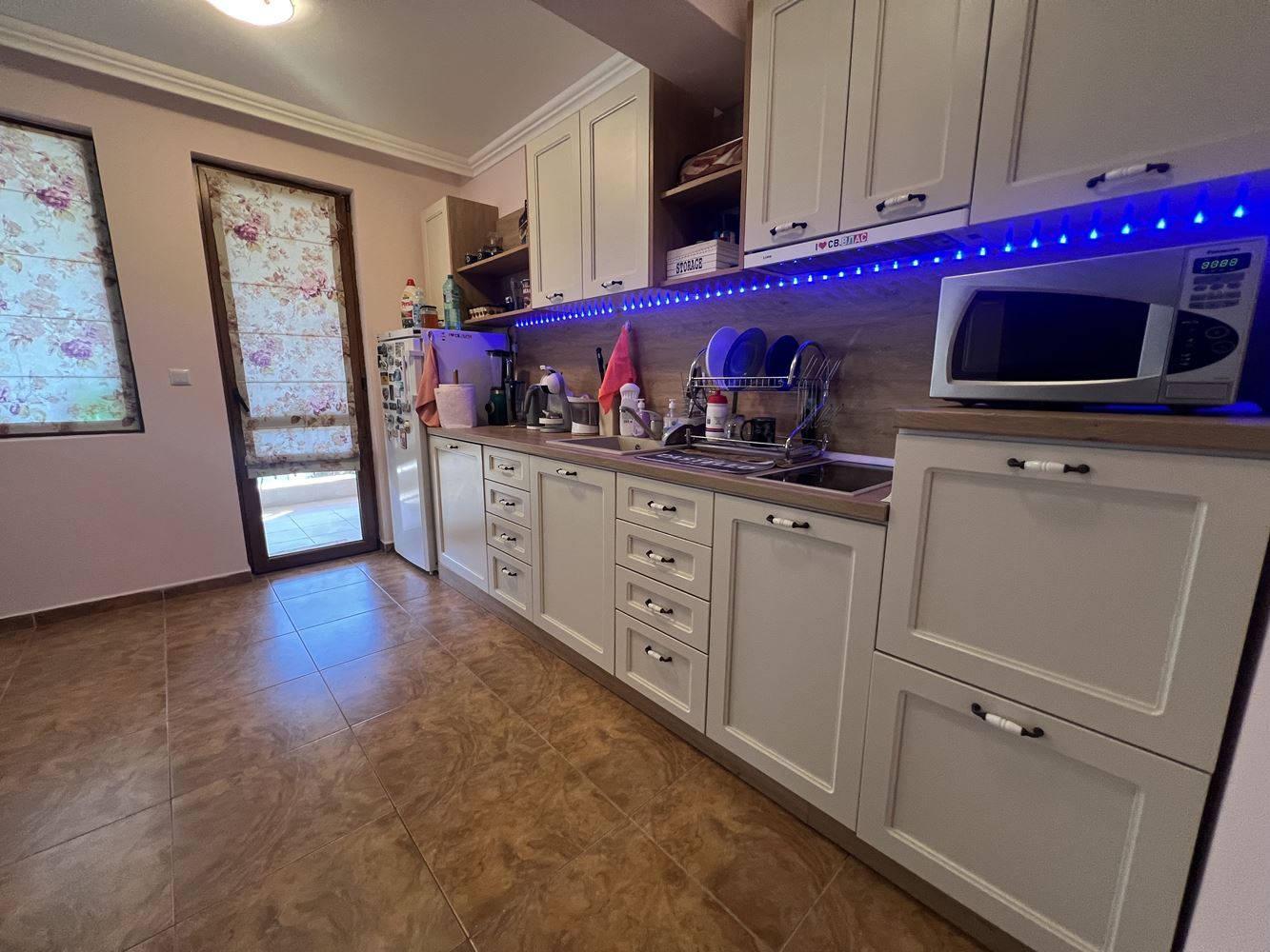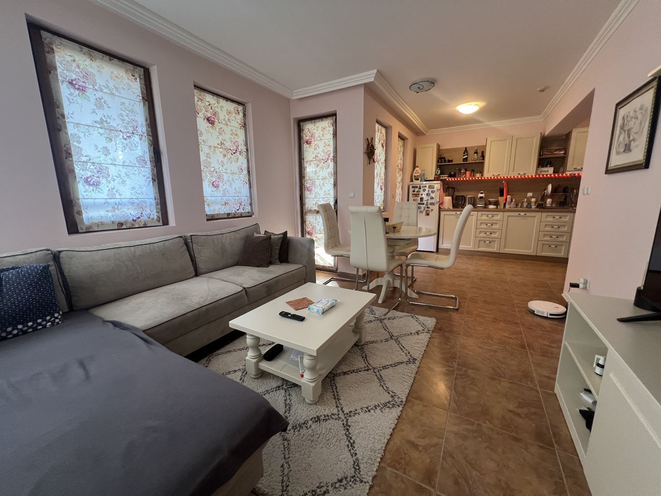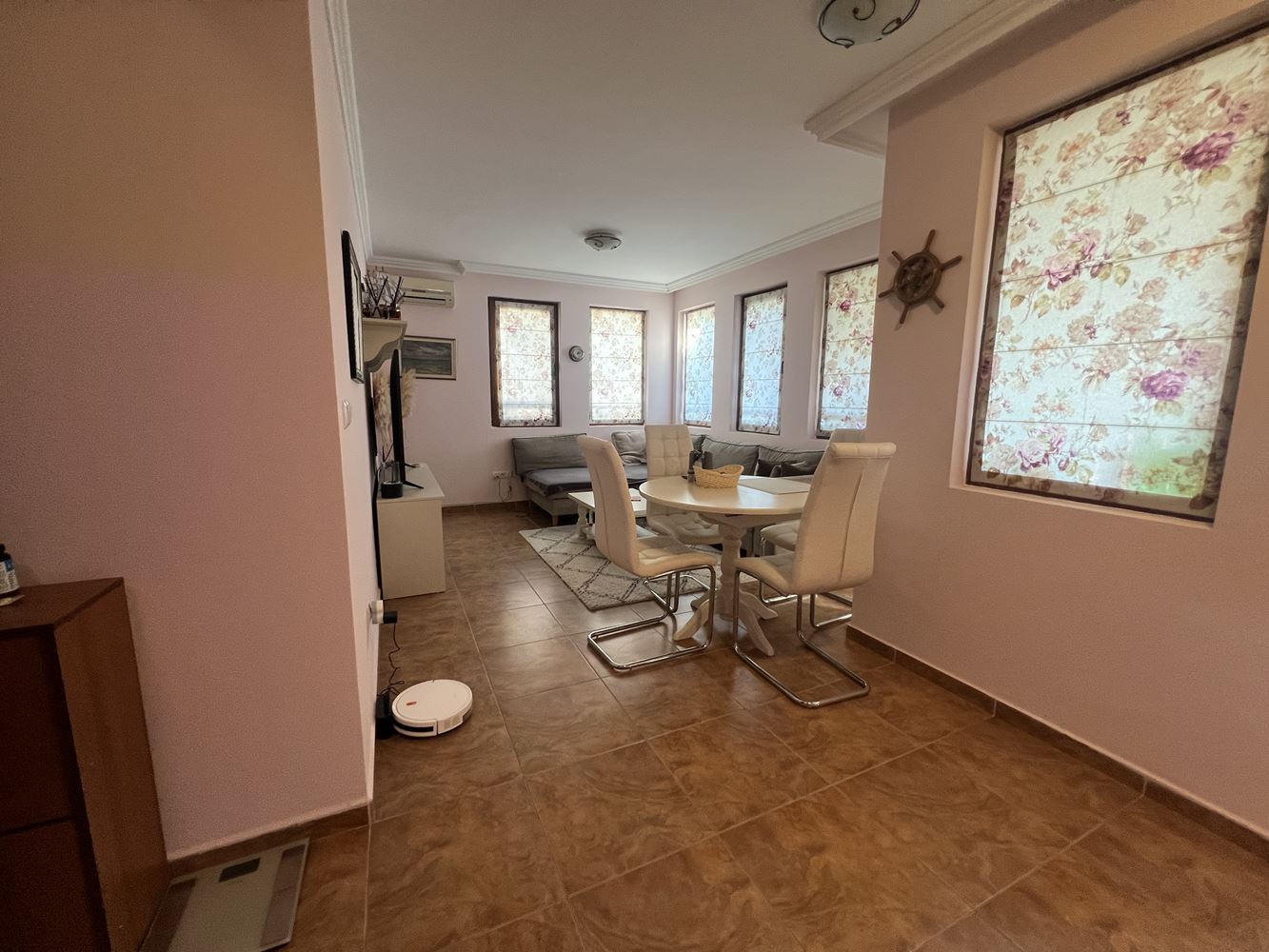 Nemovitost má plochu 80 m² a nachází se ve druhém patře. Dispozice je funkční a pohodlná, což ji činí vhodnou jak pro celoroční bydlení, tak i jako rekreační nemovitost u moře. Byt disponuje světlým a prostorným obývacím pokojem s kuchyní, který vytváří útulnou atmosféru pro odpočinek a rodinné chvíle.