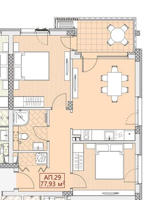 Byt má celkovou plochu 78,84 m² a nachází se ve čtvrtém patře. Dispozice je funkční a dobře promyšlená, zahrnuje vstupní chodbu, prostorný obývací pokoj s kuchyňským koutem, dvě samostatné ložnice, koupelnu s WC a terasu vhodnou k odpočinku a relaxaci. Byt je nabízen na klíč, bez nábytku, což novým majitelům umožňuje zařídit jej zcela podle vlastního vkusu a stylu.