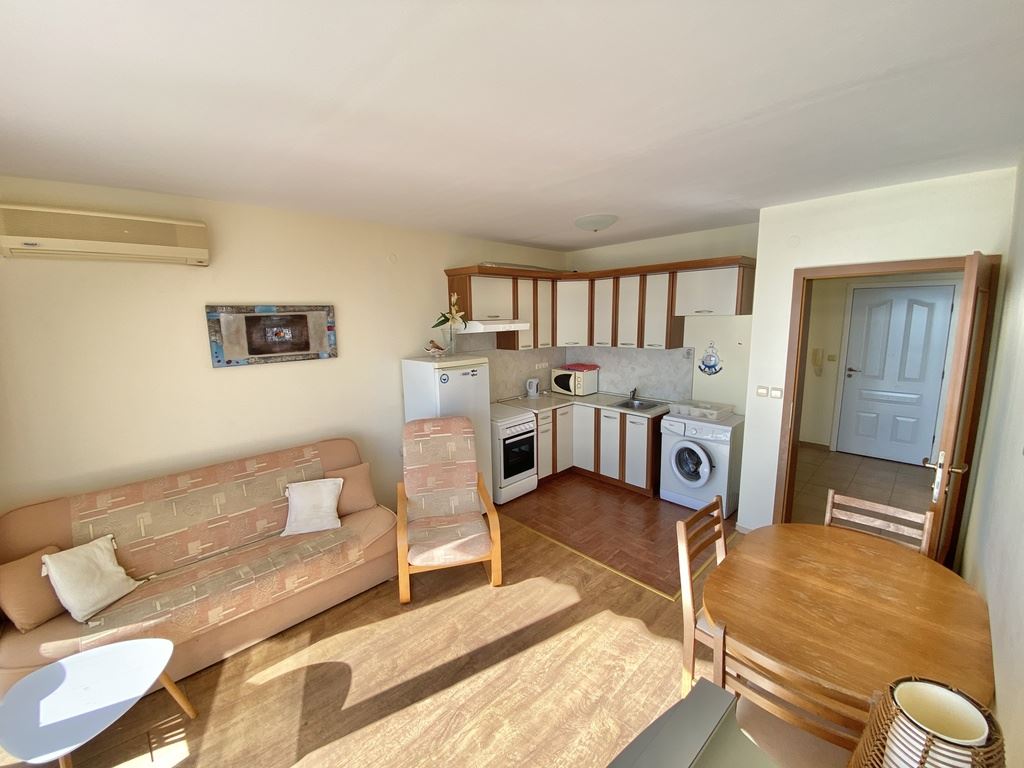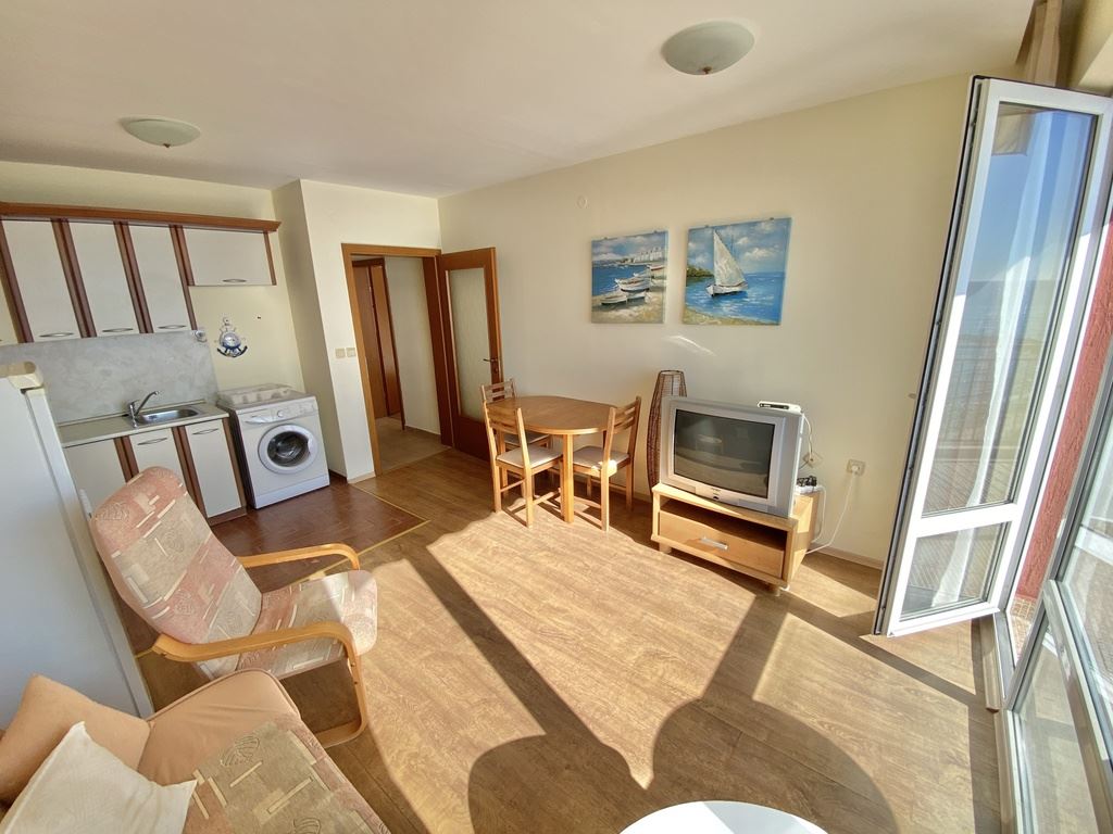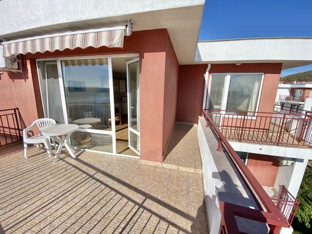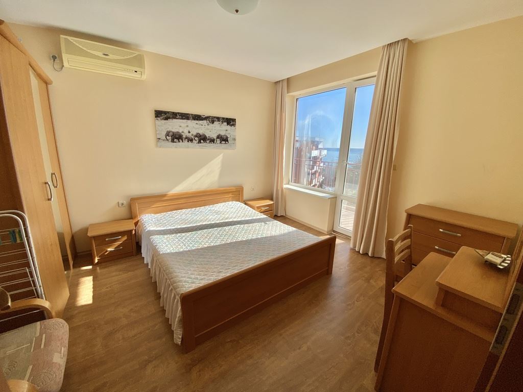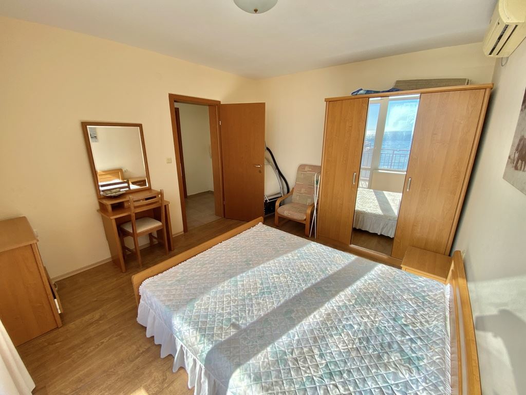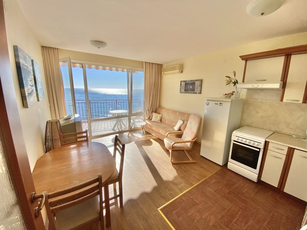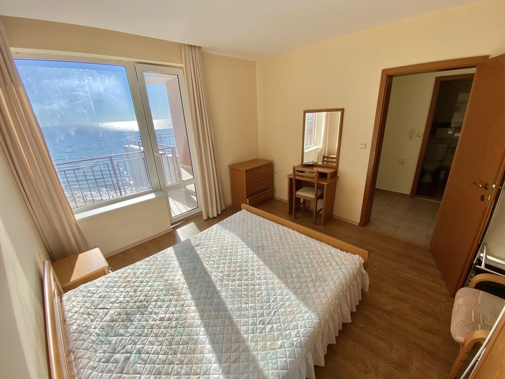 Nabízíme jednopokojový byt s neuvěřitelným výhledem na moře v komplexu v první linii moře v Elenite. Byt se nachází ve čtvrtém patře (bez výtahu) a má celkovou plochu 73 m2 (obytná plocha - 69 m2). Skládá se z předsíně, obývacího pokoje s kuchyňským koutem, ložnice, kombinované koupelny a velké terasy po celém obvodu bytu. Apartmán je orientován na jihovýchod. Z oken ložnice a obývacího pokoje, stejně jako z terasy, se otevírá úchvatný výhled na moře a záliv Slunečného pobřeží. V každé místnosti jsou nainstalovány klimatizační jednotky. Prodává se s nábytkem a elektrospotřebiči.