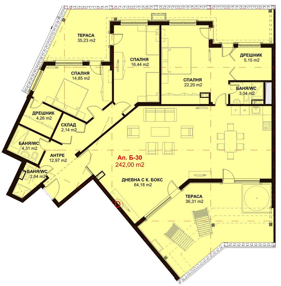 Apartmán zaujme praktickým a elegantním rozvržením. Prostorná chodba vede do obývacího pokoje s kuchyňským koutem, kde si můžete vychutnat slunečná rána a útulné rodinné večery. Tři ložnice jsou navrženy pro maximální komfort, každá nabízí dostatek prostoru a světla pro odpočinek. Byt disponuje třemi koupelnami s toaletou, dvěma šatnami a komorou, poskytující pohodlí a funkčnost pro celou rodinu. Dvě terasy nabízejí jedinečnou možnost odpočinku na čerstvém vzduchu, slunečních chvil nebo večerních setkání s přáteli s výhledem na zeleň a klid komplexu.