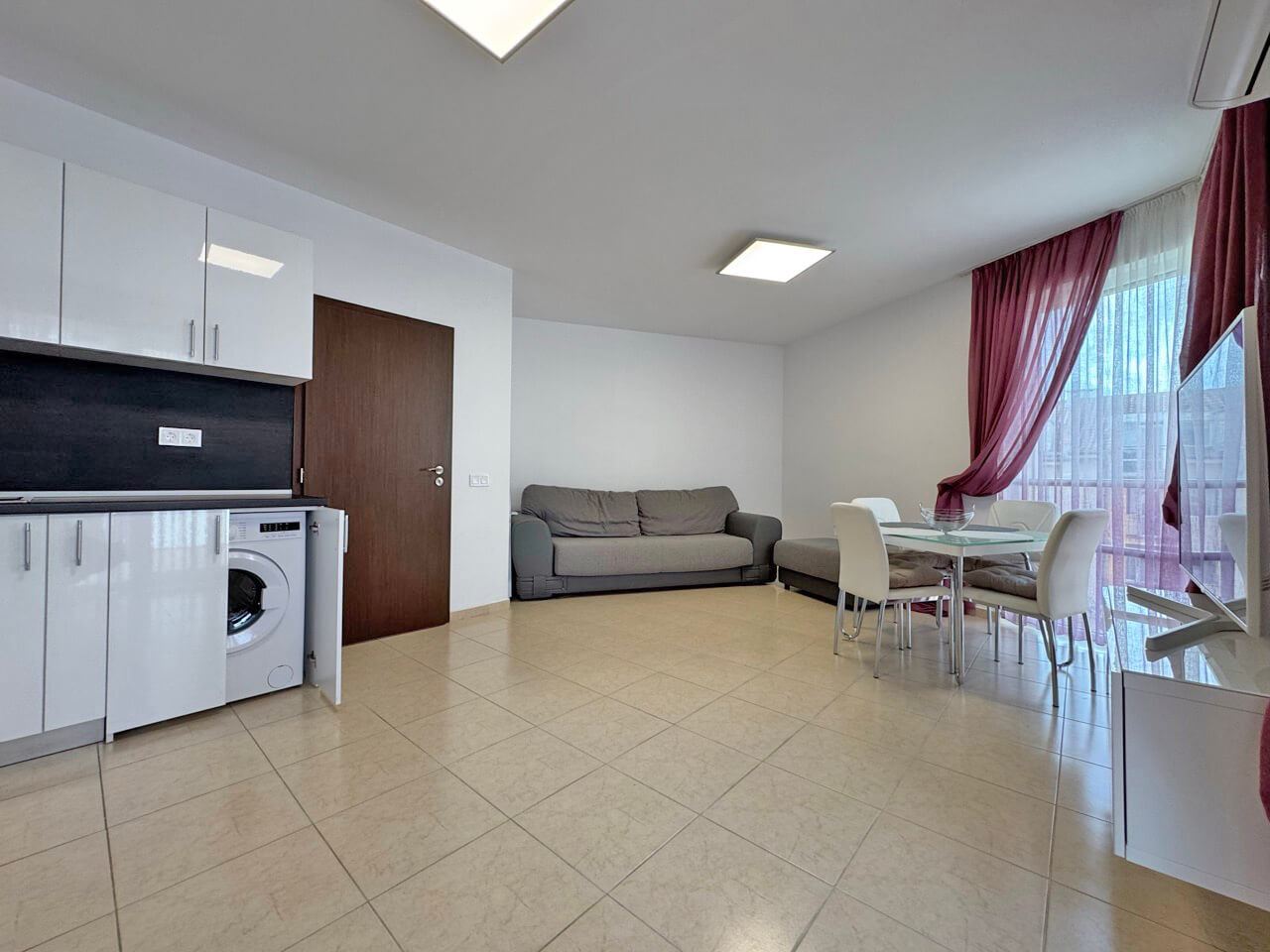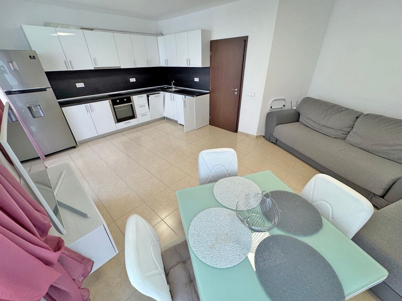 Apartmán zahrnuje prostorný obývací pokoj s funkčními zónami pro jídlo a odpočinek, jednu útulnou ložnici a moderně vybavenou koupelnu, čímž vytváří ideální prostředí pro každodenní život a relaxaci. Balkon nabízí malebný výhled na komplex, kde si můžete užívat klid a krásu okolního prostředí.