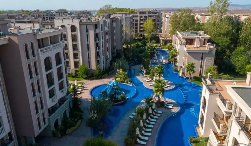 Komplex, ve kterém se apartmán nachází, je navržen jako samostatná zelená oáza. Na jeho území se rozprostírá rozsáhlý zelený park, vhodný pro procházky, venkovní aktivity i pořádání sportovních a společenských akcí. Dvě umělá jezera, obklopená palmami a pohodlnými houpacími sítěmi, umocňují pocit harmonie s přírodou a nabízejí ideální místa k odpočinku. Pro rodiny s dětmi nabízí komplex mimořádně bohatou infrastrukturu – čtyři dětská hřiště a dva mini aquaparky, které zajišťují zábavu pro nejmenší po celý den. Milovníci vodních radovánek ocení deset bazénů s dětskými částmi, rozmístěných tak, aby byly snadno dostupné z každé části areálu. Skutečnou pýchou a jedinečnou výhodou je jediný 50metrový bazén olympijských rozměrů ve Slunečním pobřeží, vybavený systémem filtrace vody bez použití chemikálií. Pro aktivní obyvatele jsou k dispozici jedno vnitřní a jedno venkovní fitness centrum, umožňující udržování zdravého životního stylu v moderním a příjemném prostředí. Relaxační zóna je doplněna o kosmetický salon, tři SPA centra a tři sauny, navržené pro zlepšení kvality odpočinku a celkovou regeneraci.