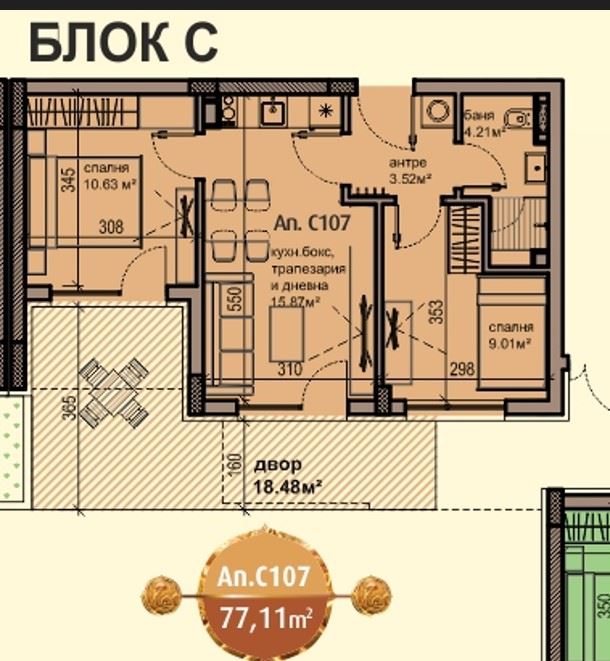 Představujeme moderní dvoupokojový byt se soukromou zahrádkou, nacházející se v novém, perspektivním komplexu v Ravdě, jen 300 metrů od moře. Byt má celkovou plochu 77,11 m² a nachází se v přízemí, s vlastní zahrádkou o ploše 18,45 m², která poskytuje další prostor pro relaxaci, zahradničení nebo příjemné večery venku. Byt je nabízen bez nábytku, dokončený “na klíč”, s vybavenou koupelnou, což umožňuje budoucímu majiteli realizovat interiér podle osobního vkusu a stylu. Dispozice zahrnuje předsíň, světlý obývací pokoj s kuchyňským koutem, samostatnou ložnici a koupelnu s WC, se vstupem do soukromé zahrady ze všech hlavních místností. To činí nemovitost ideální volbou pro rodiny, páry nebo osoby hledající pohodlné rekreační či celoroční bydlení v blízkosti moře.