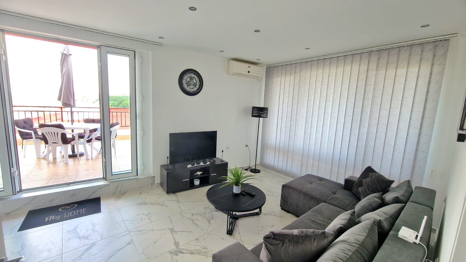 Apartmán je kompletně zrekonstruovaný, vybavený novým nábytkem a moderní technikou, vybranými s důrazem na detail a funkčnost. Světlé místnosti a panoramatická okna zajišťují dostatek přirozeného světla, zatímco dispozice vytváří harmonické prostředí pro odpočinek i celoroční bydlení. Velká terasa je ideálním místem pro ranní kávu při východu slunce nad mořem nebo večerní relaxaci při chladivém vánku.