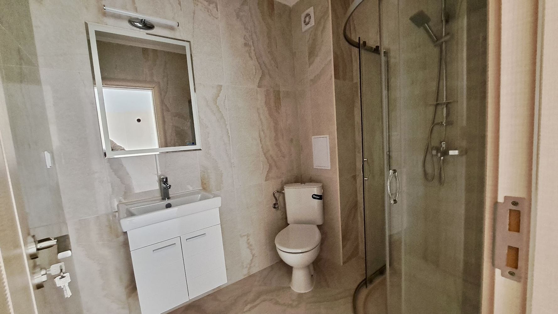 Byt je výjimečně dobře navržený a funkční. Uvnitř najdete prostornou předsíň, světlý obývací pokoj, dvě pohodlné ložnice, dvě moderní koupelny a velký balkon s panoramatickým výhledem na moře. Dispozice zajišťuje komfort a soukromí, přičemž nabízí světlé a prostorné společné prostory pro rodinné chvíle a společenská setkání. Nemovitost je vhodná pro celoroční bydlení, letní dovolenou nebo pronájem, kombinující praktickost a estetiku.
