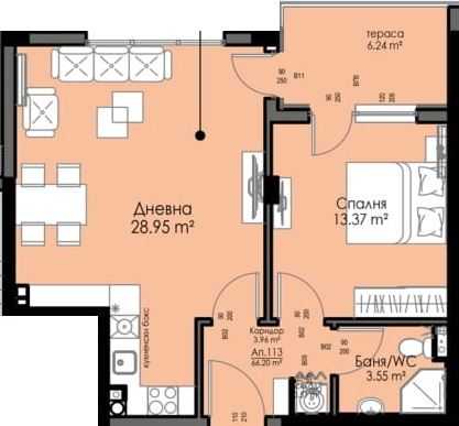 Dispozice je mimořádně funkční a praktická. Byt zahrnuje prostornou vstupní halu, světlý obývací pokoj s kuchyňským koutem, samostatnou ložnici, koupelnu s toaletou a terasu s příjemnou panoramatickou perspektivou. Obývací prostor je navržen tak, aby umožnil různé interiérové řešení – od moderního minimalismu po klasický styl. Ložnice poskytuje pohodlí a dostatek prostoru pro velkou šatní skříň a plnohodnotnou relaxační zónu. Terasa je ideálním místem pro ranní kávu nebo odpočinek po dlouhém dni.
