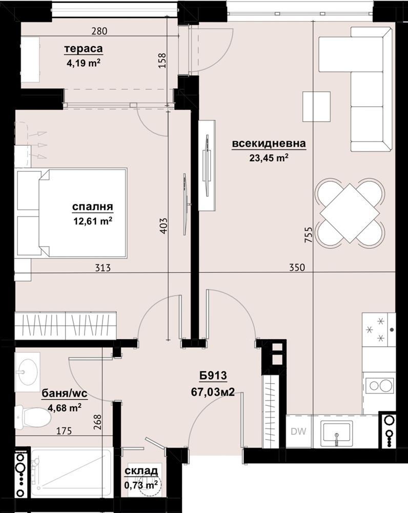 Byt je navržen s praktickým a promyšleným uspořádáním, které zajišťuje maximální pohodlí a optimální využití prostoru. Dispozice zahrnuje prostorný obývací pokoj s kuchyňským koutem, útulnou ložnici, koupelnu s WC, vstupní chodbu a terasu. Velká okna zajišťují dostatek přirozeného světla, čímž vytvářejí světlou a příjemnou atmosféru v bytě.