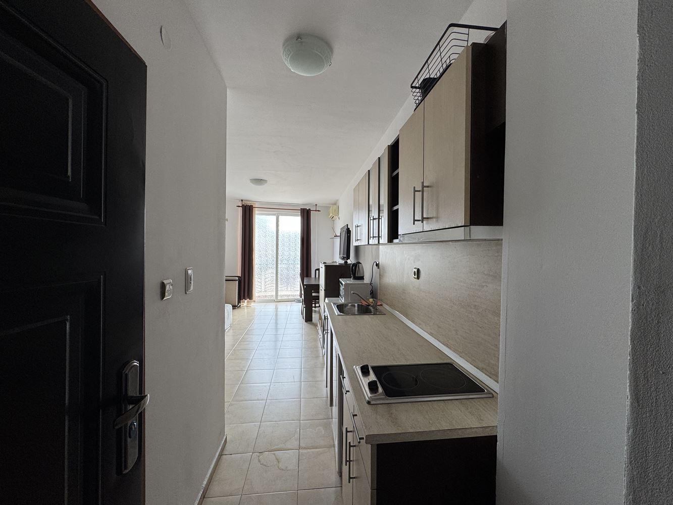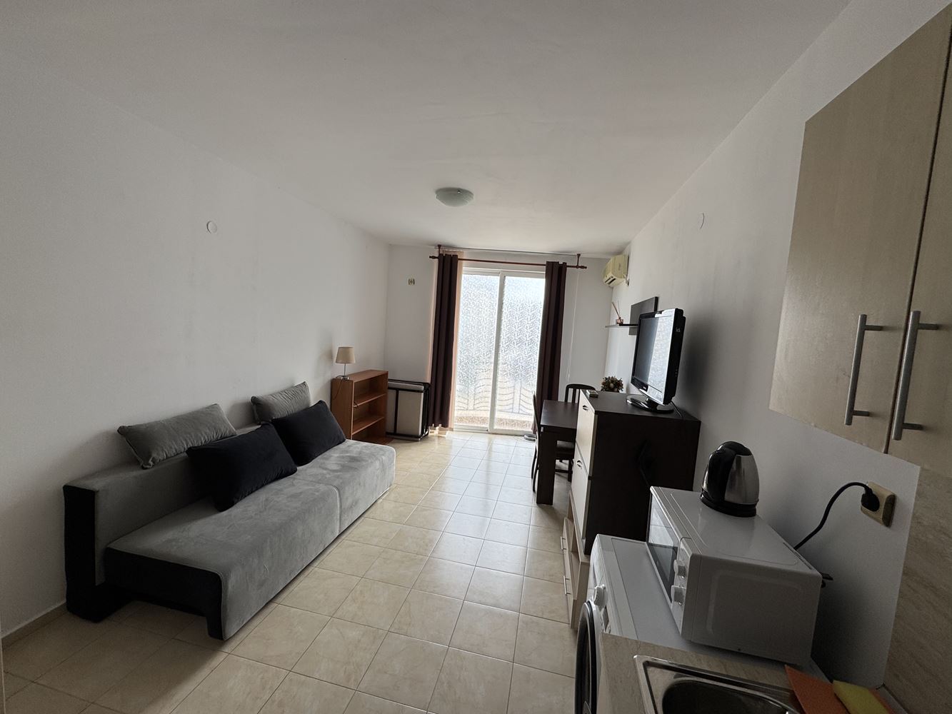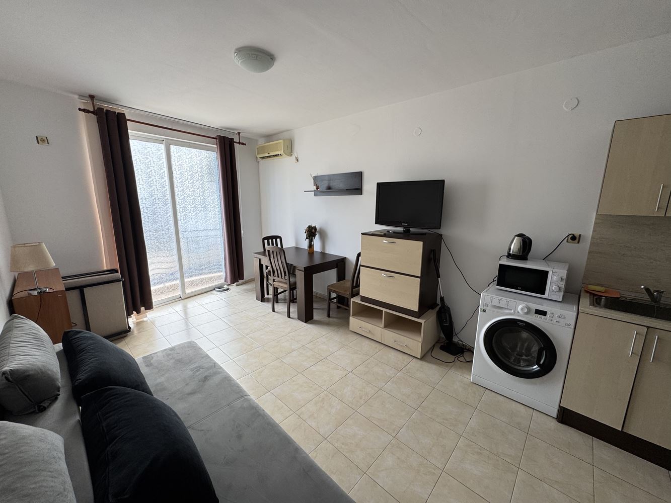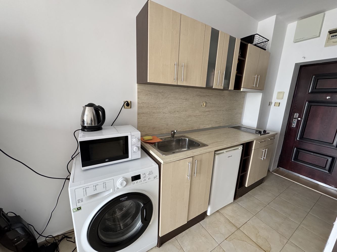 Nabízíme k prodeji kompaktní a funkční studio, nacházející se v dobře udržovaném rekreačním komplexu v rezortu Slunečné Pobřeží. Nemovitost má plošnou výměru 29 m² a nachází se ve druhém patře ze tří, což zajišťuje snadný přístup a je velmi vhodné jak pro vlastní využití, tak jako investice k pronájmu během letní sezóny. Studio je plně vybavené a připravené k okamžitému užívání. Interiér je prakticky uspořádán a vytváří útulnou atmosféru, poskytující vše potřebné pro komfortní pobyt. Prostorná místnost kombinuje obytnou a spací zónu, kuchyňský kout a koupelnu s toaletou. Z bytu je příjemný výhled na bazén, který přispívá k pocitu odpočinku a relaxace.