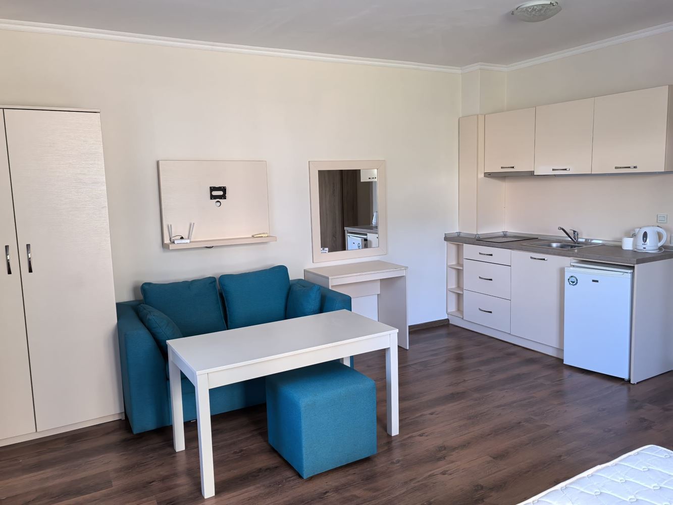 Studio je plně vybavené a zahrnuje vstupní halu, světlý a prostorný obývací pokoj s kuchyňským koutem a relaxační zónou, koupelnu s WC a terasu s výhledem na vnitřní dvůr komplexu. Prostor je dobře organizovaný a poskytuje pocit útulnosti, světla a klidu, přičemž každý detail je přizpůsoben potřebám moderního každodenního života.