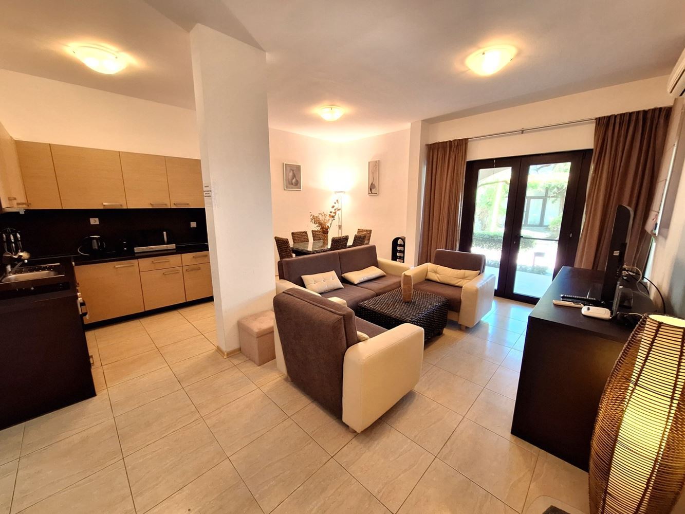 Byt zaujme prostorným a funkčním uspořádáním, navrženým pro komfortní celoroční bydlení nebo vysoce kvalitní rekreační nemovitost. Vstupní hala vede do velkého a světlého obývacího pokoje s kuchyňským a jídelním koutem, kde velká okna zajišťují dostatek přirozeného světla a příjemné propojení s venkovním prostorem. Z obývacího pokoje je vstup na prostorný balkon o ploše 15 m², který nabízí krásný výhled na park a moře – ideální místo pro ranní kávu, venkovní večeři nebo relaxaci s mořským vánkem.