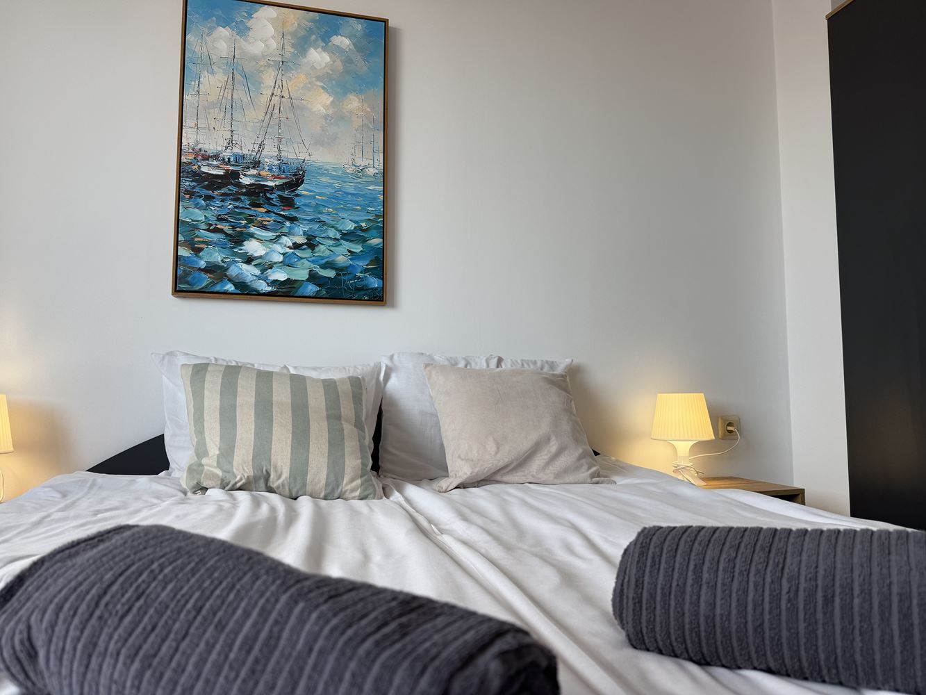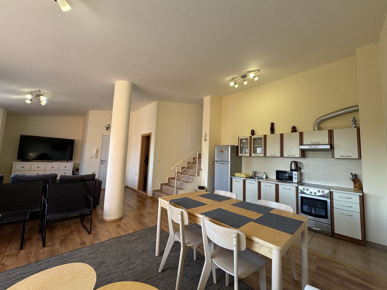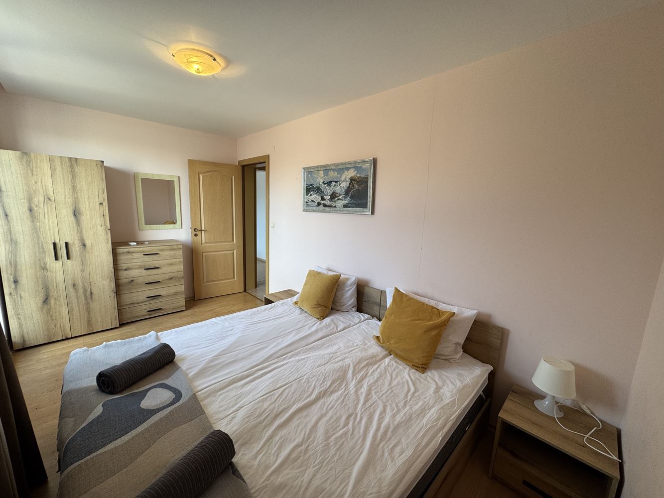 Byt zahrnuje dvě prostorné ložnice, světlý obývací pokoj s kuchyní, funkční dispozici a balkony, ze kterých se otevírá panoramatický výhled na moře. Prostorný interiér umožňuje komfortní vybavení a pohodlný způsob života, vhodný pro trvalé bydlení i rekreační účely.