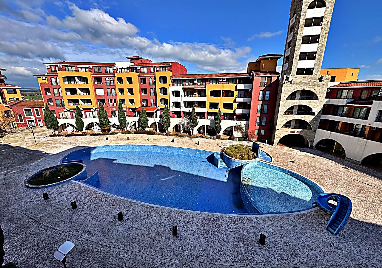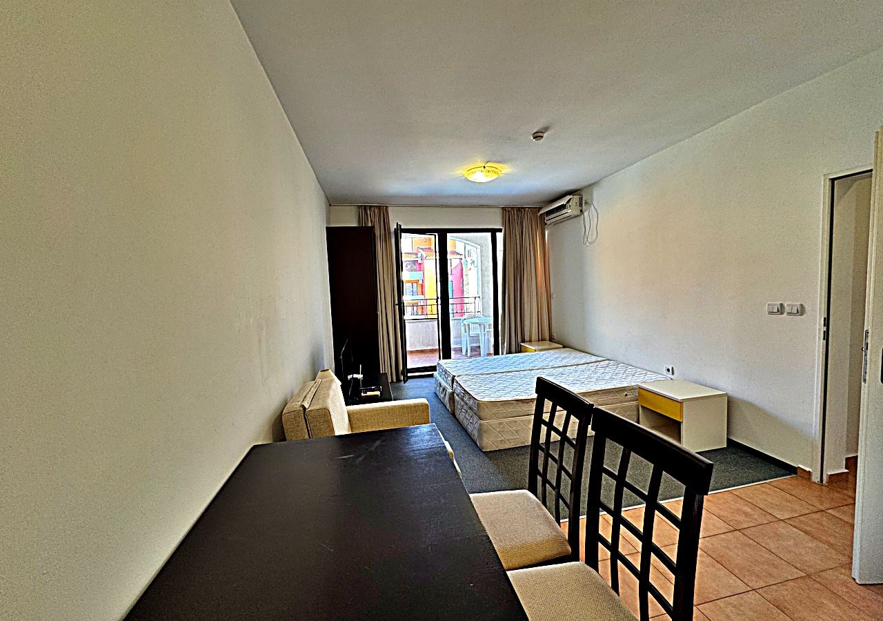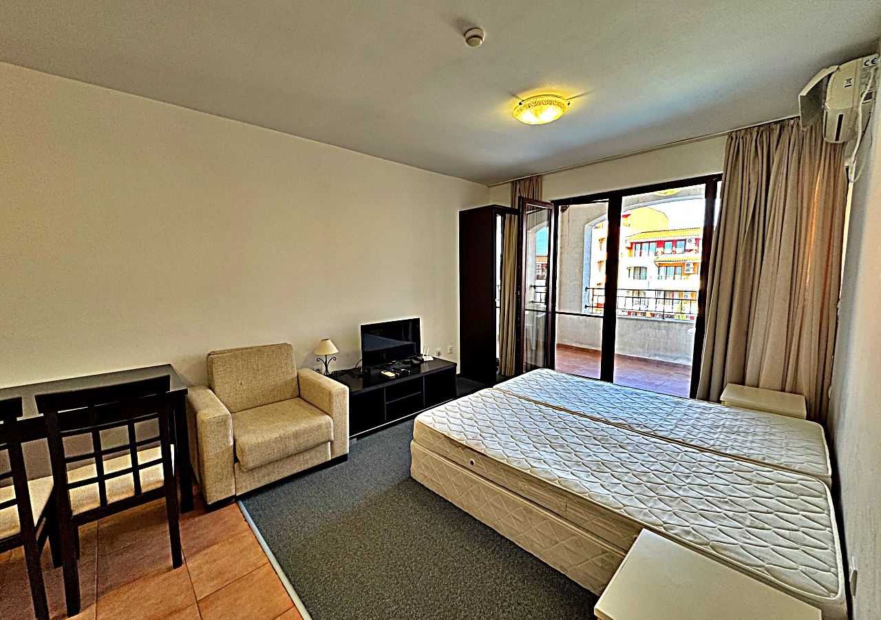 Prostorné studio s výhledem na bazén v první linii v Aheloy – světlo, prostor a přímořská inspirace