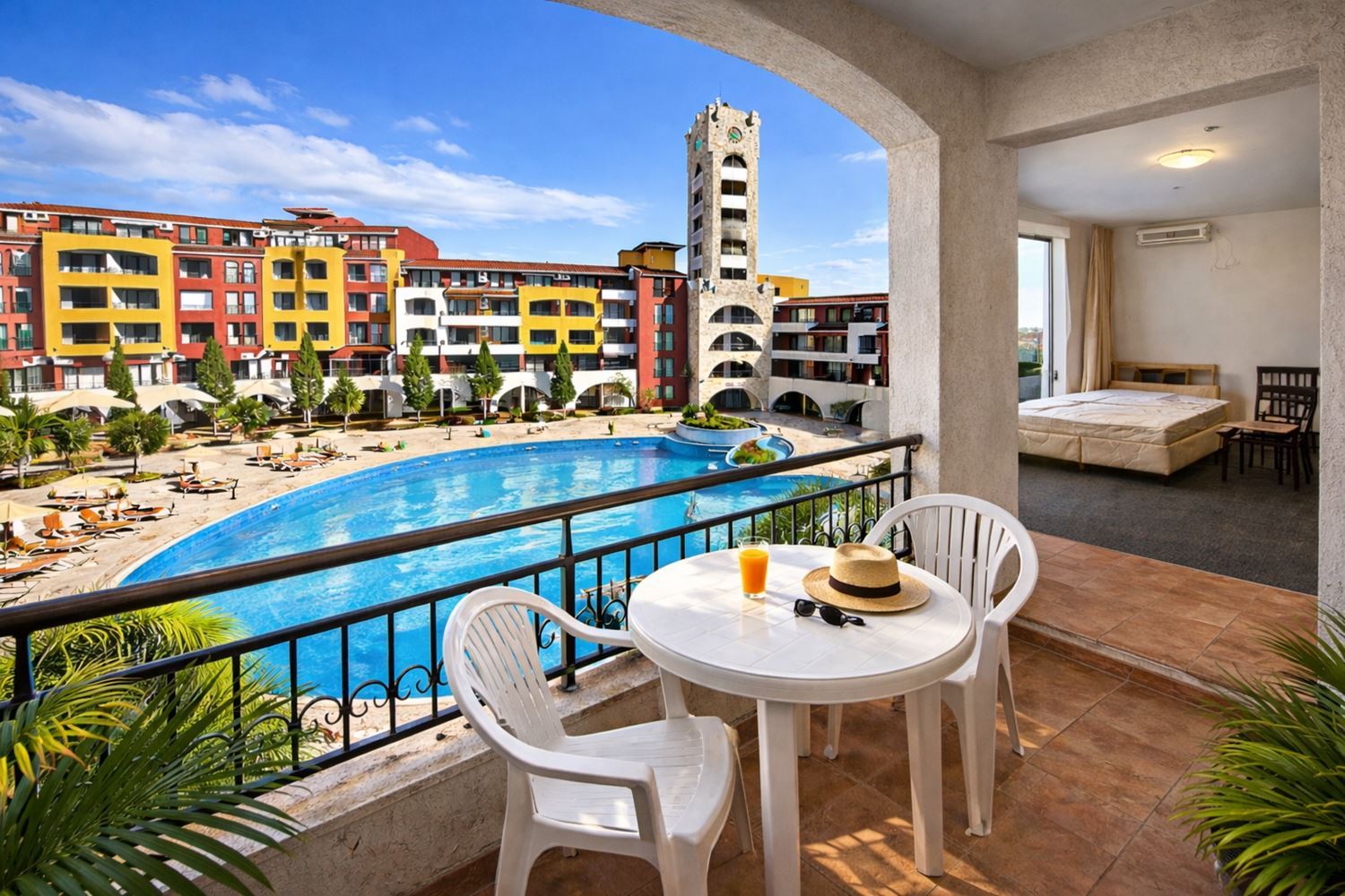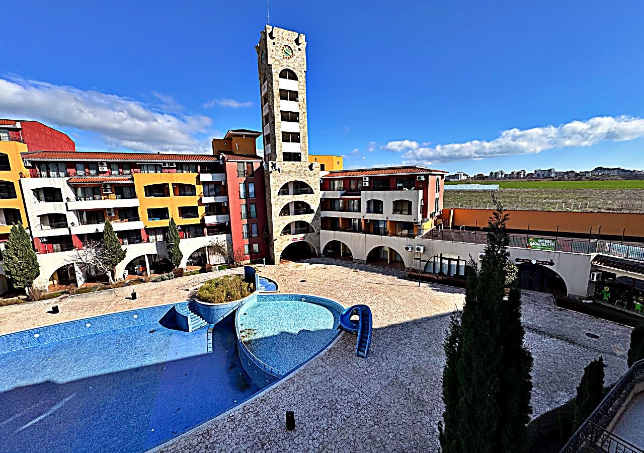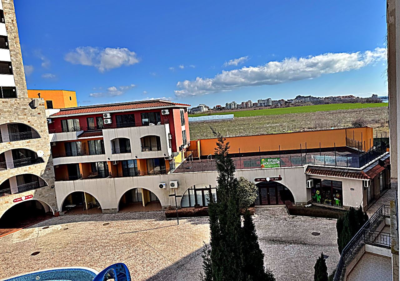 Prostorné studio s výhledem na bazén v první linii v Aheloy – světlo, prostor a přímořská inspirace