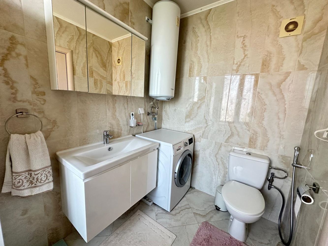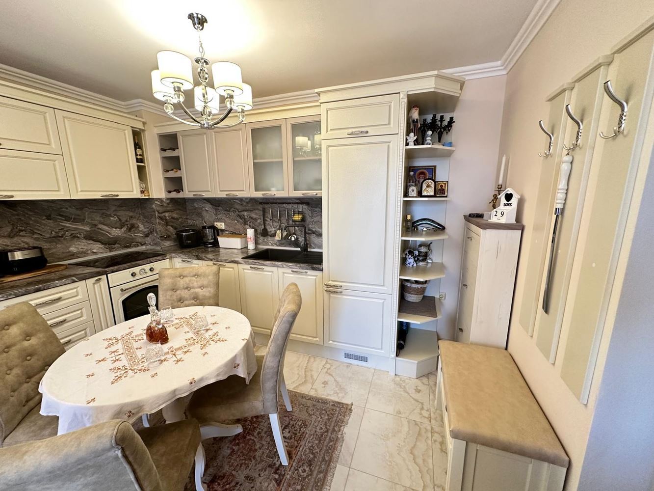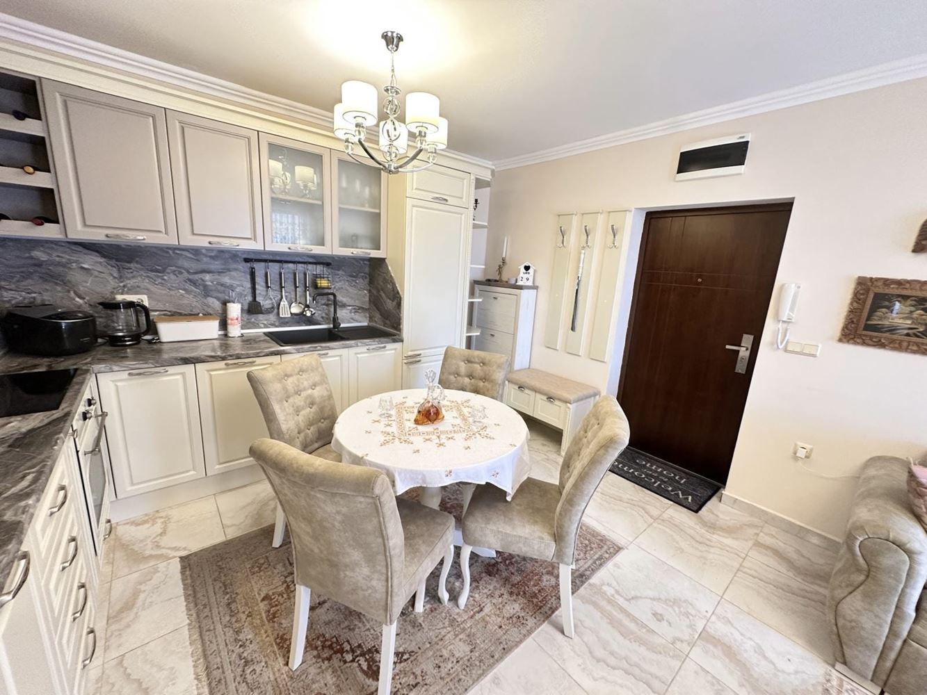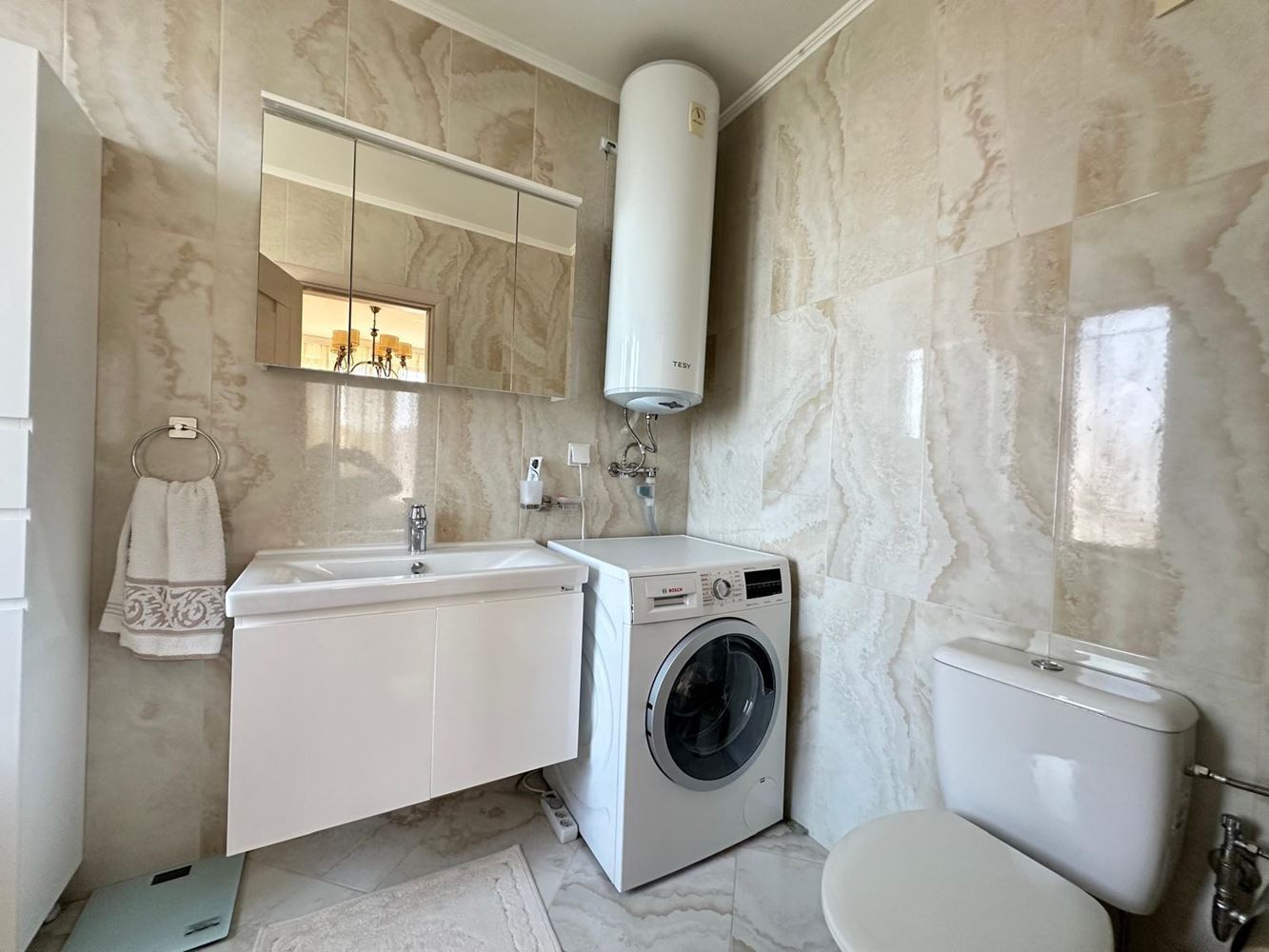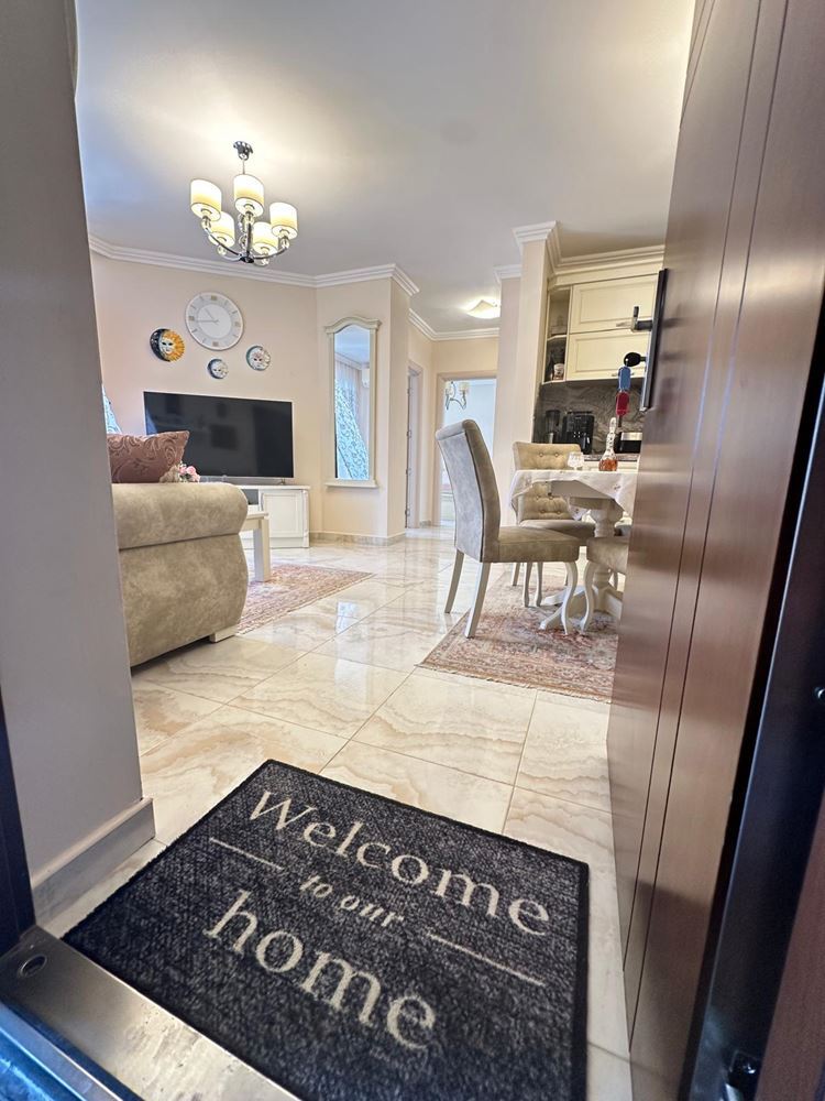 Byt zaujme funkční dispozicí a útulným prostředím. Prostorný obývací pokoj je ideální pro relaxaci a společné chvíle, zatímco plně vybavená kuchyň je připravena na vaše kulinářské nápady. Dvě světlé a pohodlné ložnice poskytují klid a soukromí — skvělé pro rodiny či hosty. Byt má dvě moderní koupelny: jednu s vanou a nádherným výhledem na moře, druhou s praktickým sprchovým koutem. Obě terasy nabízejí okouzlující výhled na moře, ideální pro ranní kávu či romantické večery.