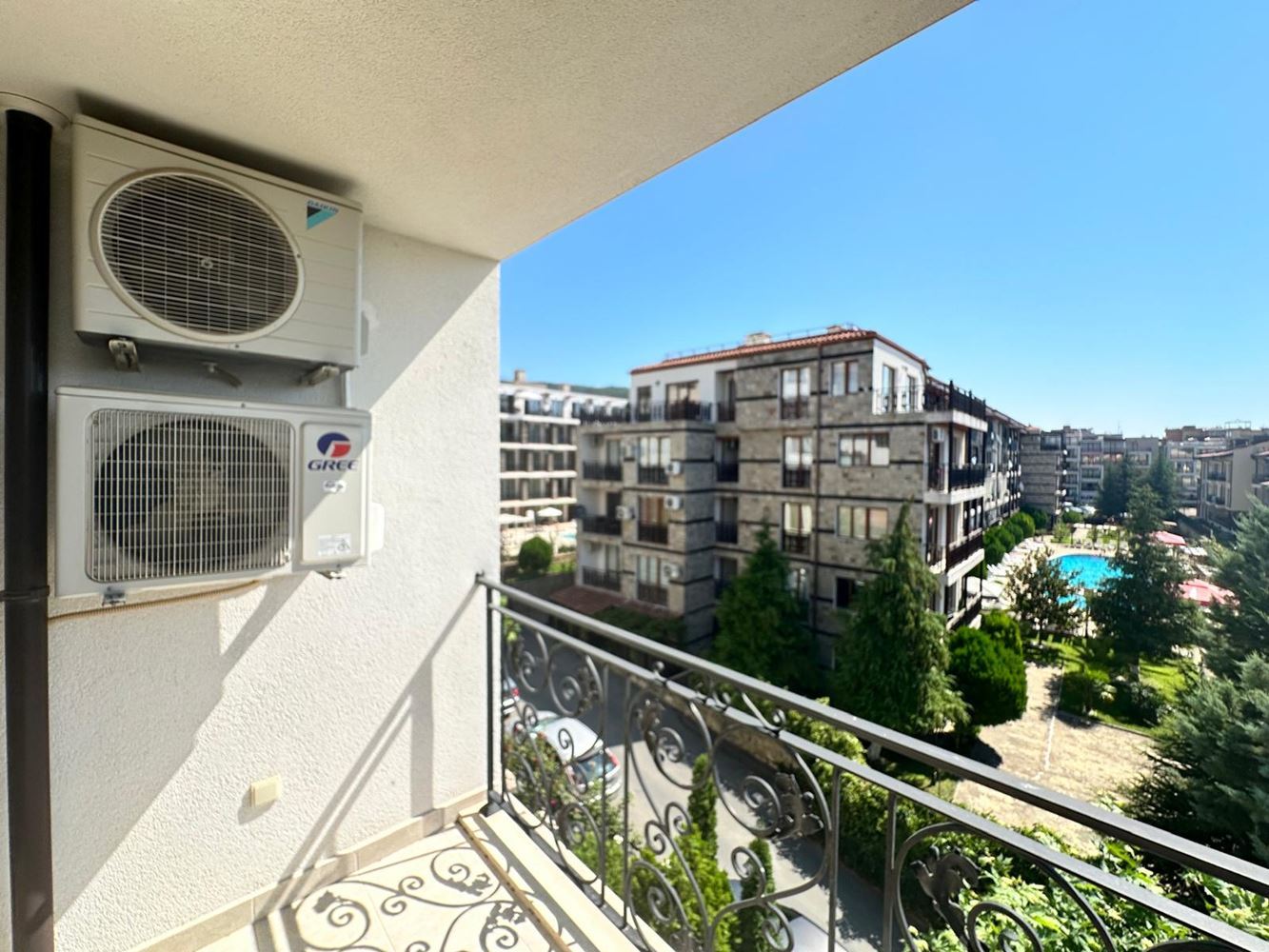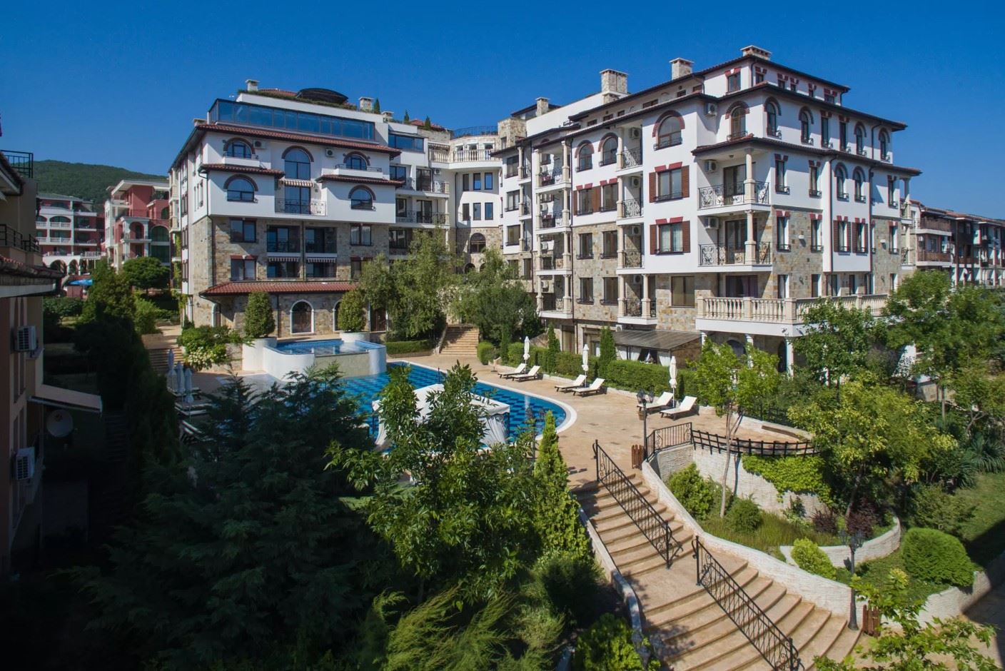 Komplex je skutečnou oázou klidu, obklopený bohatou zelení, uměleckými sochami a dekorativními fontánami, které vytvářejí pocit luxusu a harmonie. K dispozici je prostorný venkovní bazén, útulné relaxační zóny a profesionální správa budovy. Stálá ostraha zajišťuje bezpečí a moderní výtah usnadňuje přístup.