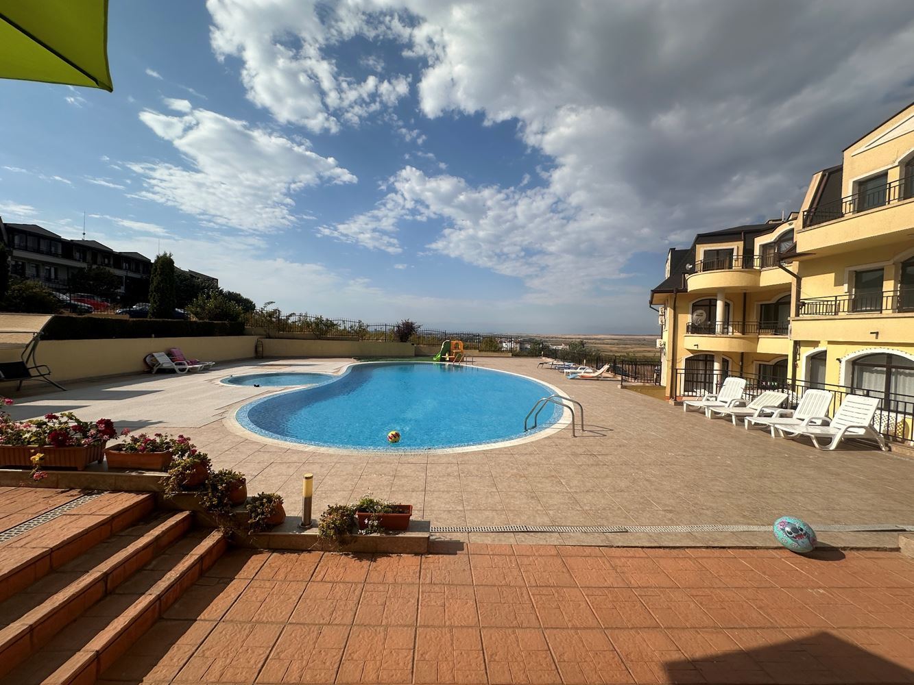 Prostorný třípokojový byt s velkou verandou a přímým vstupem k bazénu v oblasti Sunny Beach