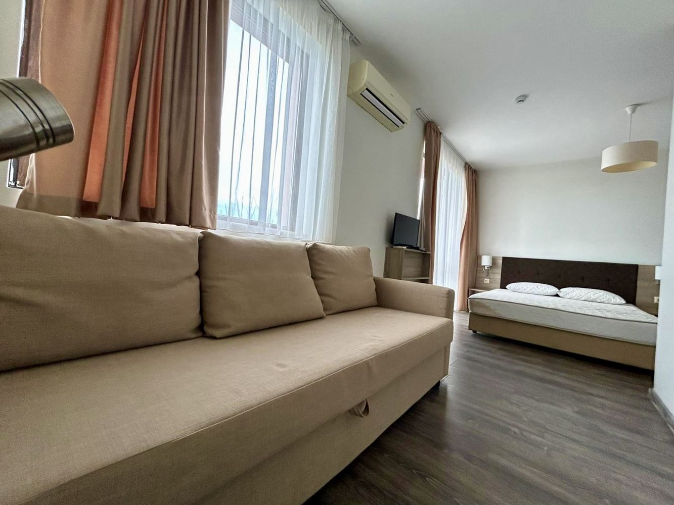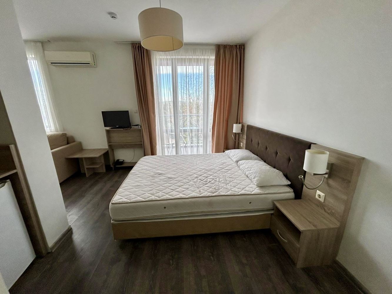 Nabízíme útulné studio, umístěné ve druhém patře moderního a velmi dobře udržovaného komplexu v Slunečném pobřeží. Nemovitost má 34,81 m² a vyniká funkční dispozicí, hojností přirozeného světla a příjemnou atmosférou, vhodnou pro osobní dovolenou i ziskový pronájem.