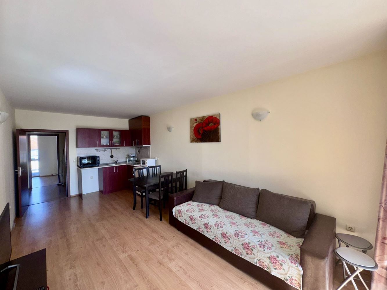 Představujeme světlý a funkční byt s jednou ložnicí o ploše 64,65 m², který se nachází ve třetím patře dobře udržovaného komplexu ve městě Aheloy. Nemovitost kombinuje komfort, praktické dispoziční řešení a klidné prostředí, což z ní činí skvělou volbu jak pro rekreační bydlení, celoroční užívání, tak i jako investici.