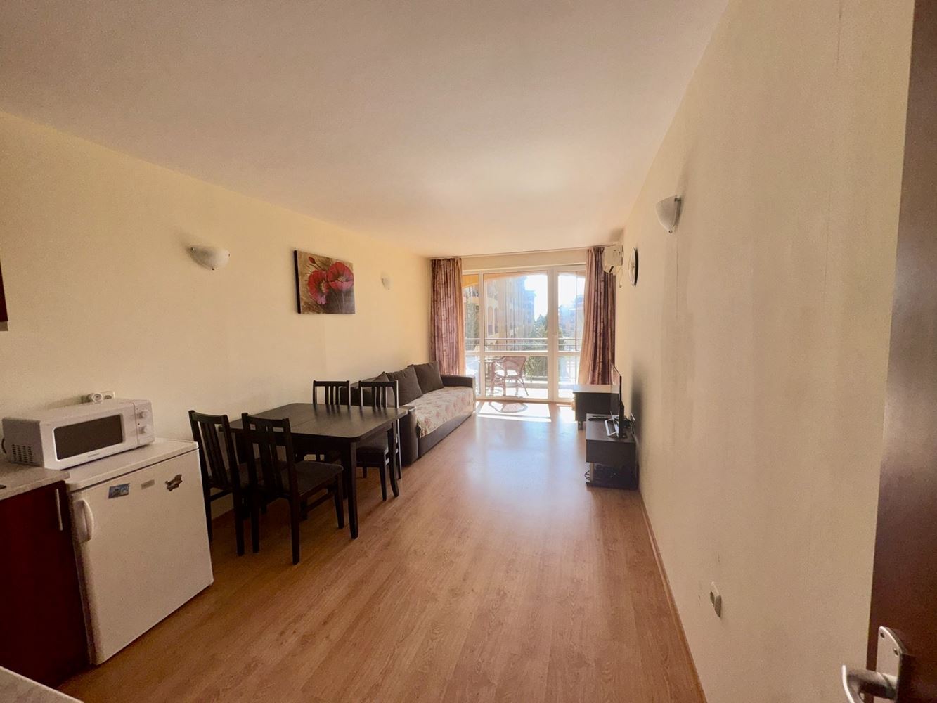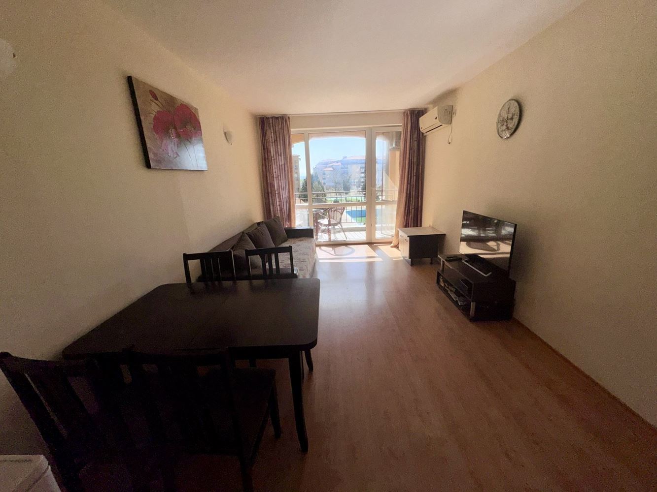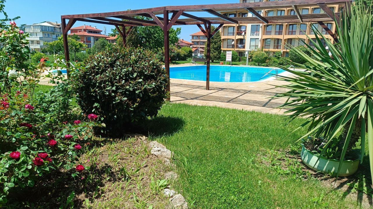 Útulný byt s jednou ložnicí, dvěma terasami a výhledem na bazén v komplexu v Aheloy